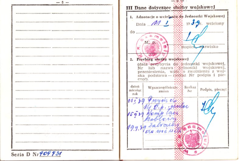 W dniu 11 stycznia 1939 roku (mając 22 lata) został powołany do 14