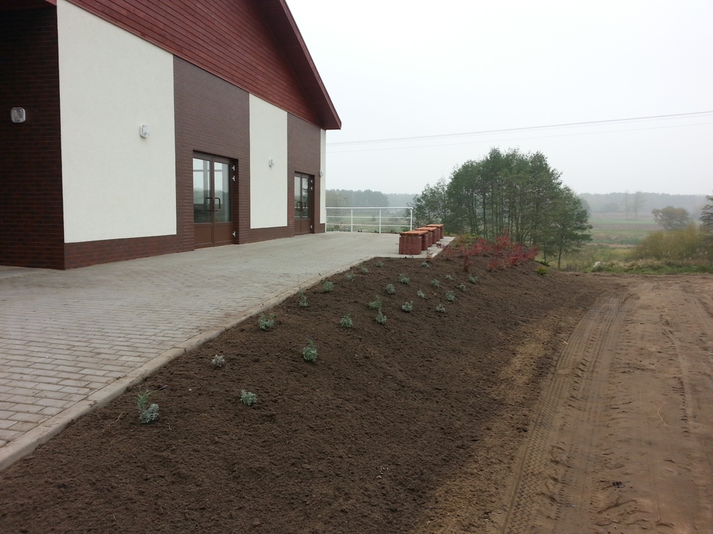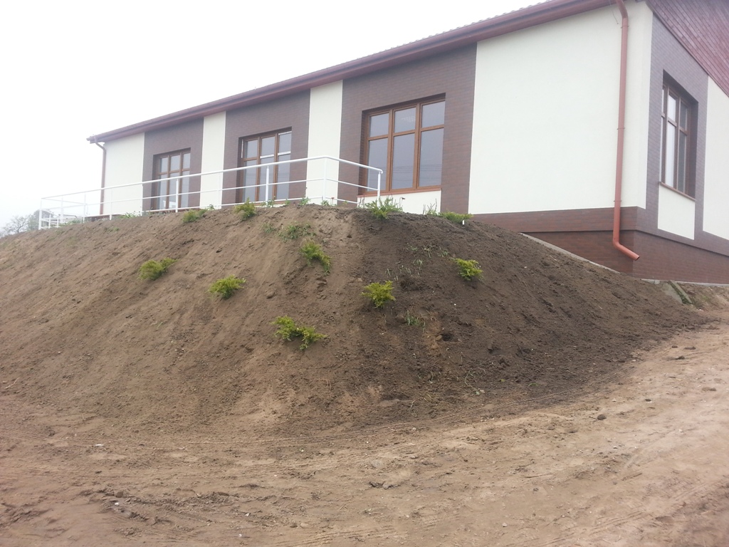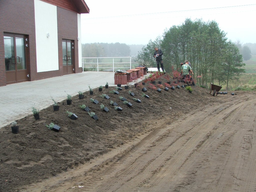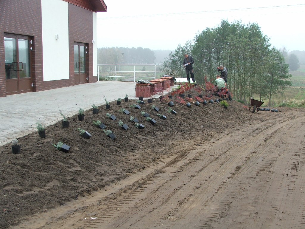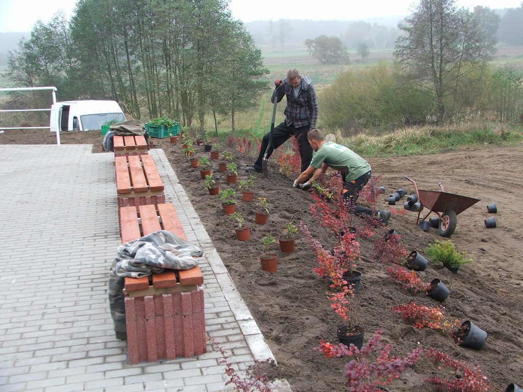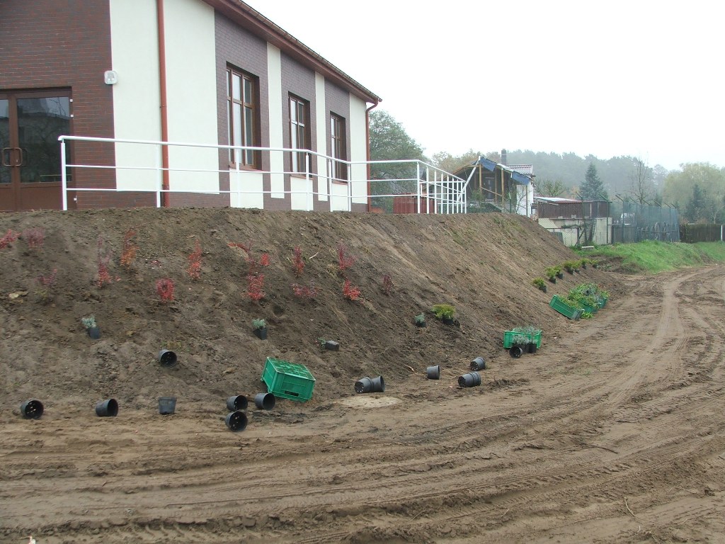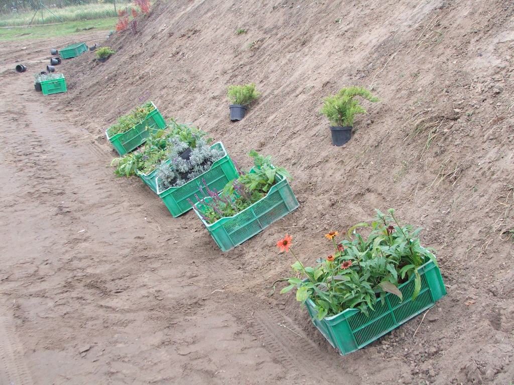 (ziemia przekazana przez rolników z Chojna), uformowanie skarpy, zasadzenie krzewów i bylin.